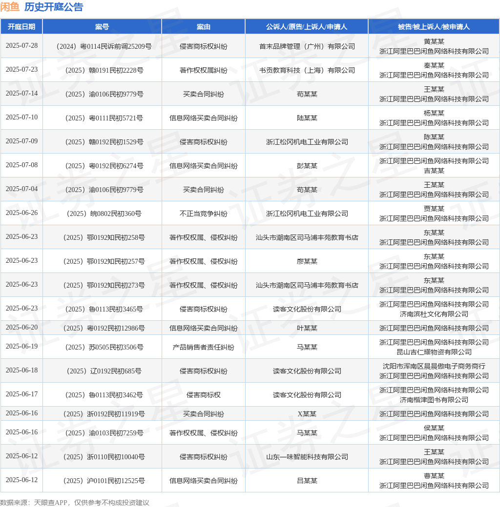 案号:(2025)浙0192民初1786号审理法院:杭州互联网法院案由:信息网络买卖合同纠纷当事人信息: 原告/上诉人:苟某某 被告/被上诉人:浙江阿里巴巴闲鱼网络科技有限公司开庭日期:2025年5月14日根据统计,近一年内以浙江阿里巴巴闲鱼网络科技有限公司为当事人的历史开庭公告有777则,其中案由为“网络服务合同纠纷”的公告以215则居首,其次为“信息网络买卖合同纠纷”有146则,“侵害商标权纠纷”有113则。历史开庭公告(前20条)如下: